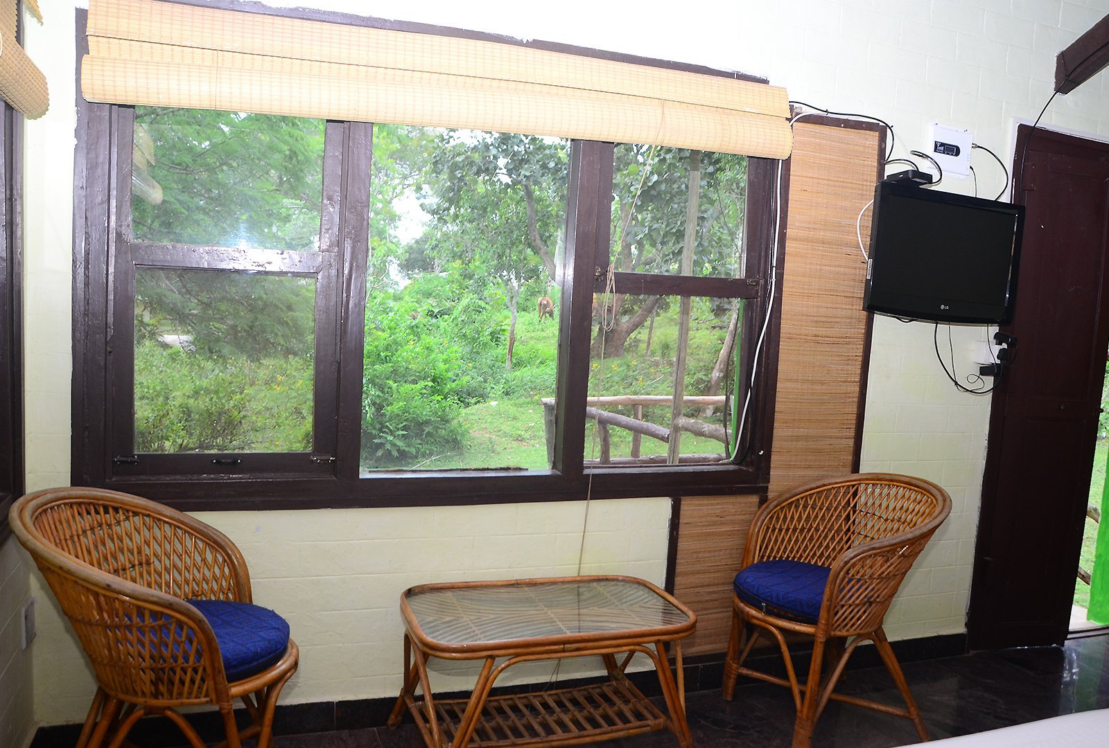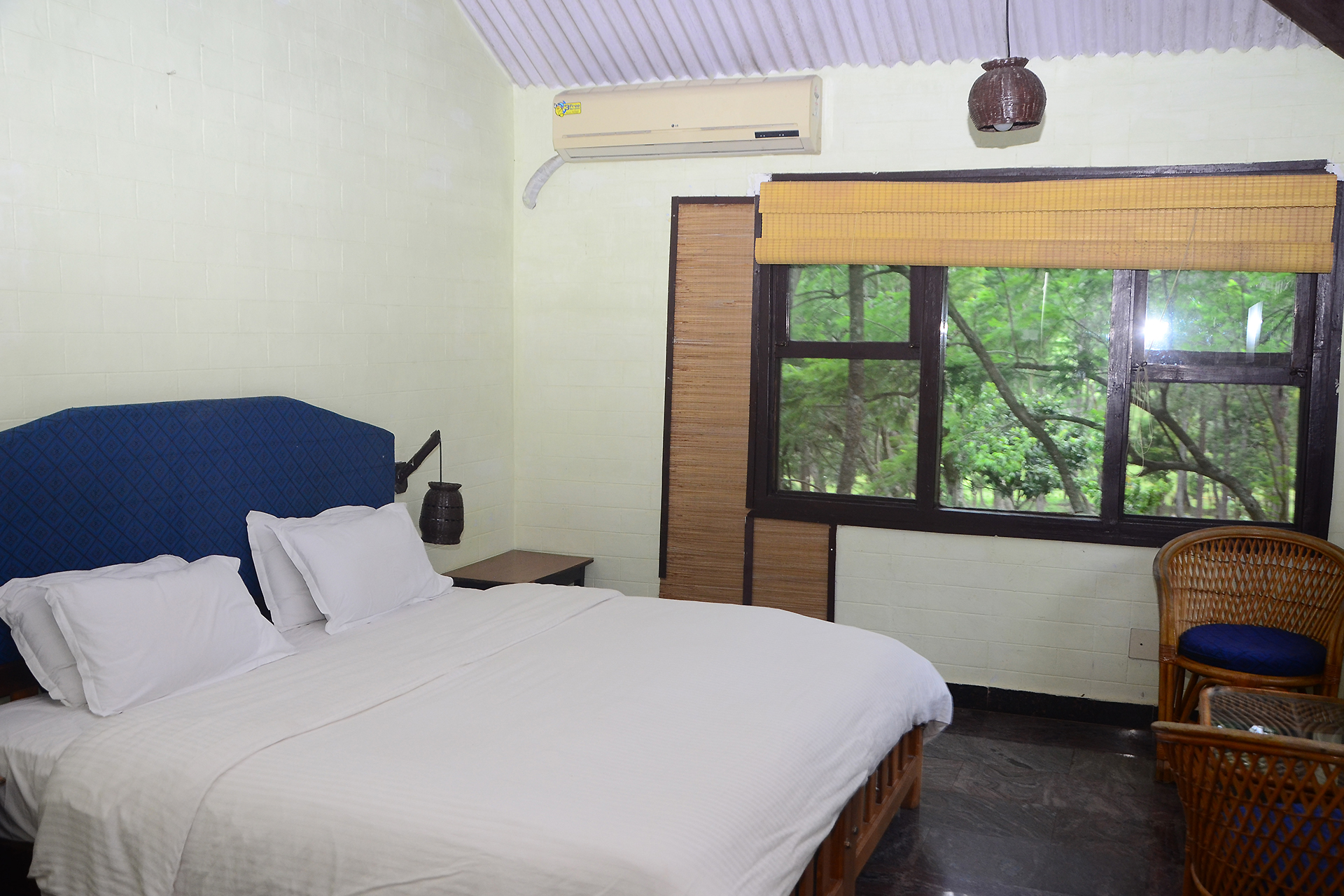 Our AC Cottage offers serene jungle views, 180 sq.ft of cozy space, a double bed, private bath - ideal for 4 guests.